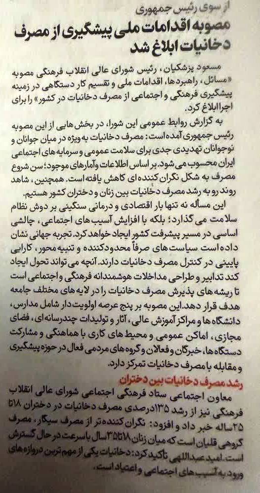 انتشار خبر ابلاغ مصوبه اقدامات ملی پیشگیری از مصرف دخانیات از سوی رئیسجمهور در روزنامه اطلاعات