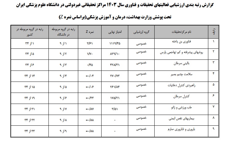 نتایج رتبهبندی مراکز تحقیقاتی دولتی و غیردولتی سال 1403، توسط دانشگاه علوم پزشکی ایران اعلام شد؛