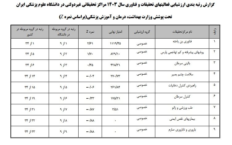 نتایج رتبهبندی مراکز تحقیقاتی دولتی و غیردولتی سال 1403، توسط دانشگاه علوم پزشکی ایران اعلام شد؛